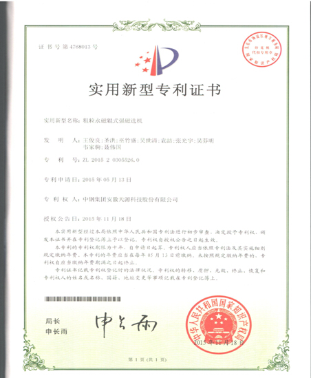 近日,中(zhong)鋼集(ji)團(tuan)安(an)徽天源科(ke)技股份(fen)有限公司(si)又有一項實用(yong)新型(xing)專利——“粗粒永磁輥(gun)式強磁選機(ji)”喜獲國家(jia)知(zhi)識產權(quan)局(ju)授權(quan),專利號(hao)為ZL201520305526.0。