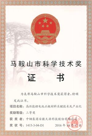 會議宣(xuan)讀了《馬鞍山(shan)市人(ren)民政府關于2014-2015年度馬鞍山(shan)市科(ke)學技術獎勵的決定》,中鋼天源駱艷(yan)華、楊(yang)洋、裴曉(xiao)東等(deng)同志承擔的省科(ke)技攻關項目《高性能鋰電池正極(ji)材料關鍵技術及(ji)產(chan)業化》獲得“馬鞍山(shan)市科(ke)技進步三等(deng)獎”。