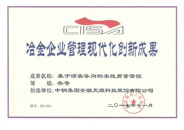 據悉,2017年冶金企業管理現代化創新成果評選結果日前揭曉,中鋼天源本部申報的管理創新成果《基于顧客導向的柔性質量管控》榮獲三等獎。