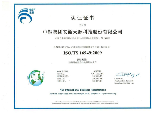 中鋼天源釹鐵硼廠獲得ISO/TS16949:2009質量管理體系認證證書