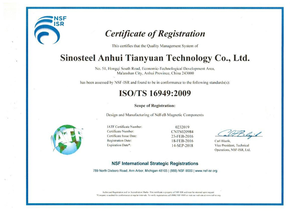 中(zhong)鋼天源釹鐵硼(peng)廠ISO/TS16949:2009質(zhi)量管理體系(xi)認證(zheng)(zheng)工作,經過(guo)半年多時間的積極(ji)準備,順利(li)通(tong)過(guo)了(le)審核專家組的審核,近日收(shou)到了(le)NSF-ISR認證(zheng)(zheng)公司頒發(fa)的認證(zheng)(zheng)證(zheng)(zheng)書。