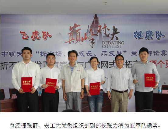 5月27日下午(wu),中(zhong)(zhong)鋼(gang)天源(yuan)第(di)一培訓教室成為激情和歡樂的海洋,掌聲(sheng)和歡呼(hu)聲(sheng)不(bu)斷,由中(zhong)(zhong)鋼(gang)天源(yuan)綜合、市場(chang)(chang)部(bu)(合署)、團(tuan)委(wei)聯合主(zhu)辦的“拓市場(chang)(chang)、促(cu)成長(chang)、求發展”主(zhu)題辯論賽決(jue)賽隆重舉行,唇(chun)槍舌(she)劍、精(jing)彩紛呈,各(ge)大獎(jiang)項(xiang)相繼(ji)出爐,為這(zhe)場(chang)(chang)賽程近一個月、上百名員(yuan)工(gong)參與(yu)的活動畫上完美的句號。共(gong)青(qing)團(tuan)馬鞍山市委(wei)書(shu)記(ji)(ji)(ji)錢俊、安徽工(gong)業大學黨(dang)委(wei)組織部(bu)副(fu)部(bu)長(chang)張為清應邀擔任評委(wei),中(zhong)(zhong)鋼(gang)天源(yuan)董事長(chang)、黨(dang)委(wei)書(shu)記(ji)(ji)(ji)洪石(shi)笙(sheng)、總經(jing)理張野(ye)、黨(dang)委(wei)副(fu)書(shu)記(ji)(ji)(ji)、紀委(wei)書(shu)記(ji)(ji)(ji)亞海斌、副(fu)總經(jing)理芮沅林、副(fu)總經(jing)理余(yu)進出席比賽并頒獎(jiang)。公司高管、各(ge)部(bu)門、各(ge)單位(wei)負責人、各(ge)黨(dang)支部(bu)書(shu)記(ji)(ji)(ji)、團(tuan)支部(bu)書(shu)記(ji)(ji)(ji)及部(bu)分(fen)青(qing)年代表共(gong)80余(yu)人到場(chang)(chang)觀看(kan)了比賽。