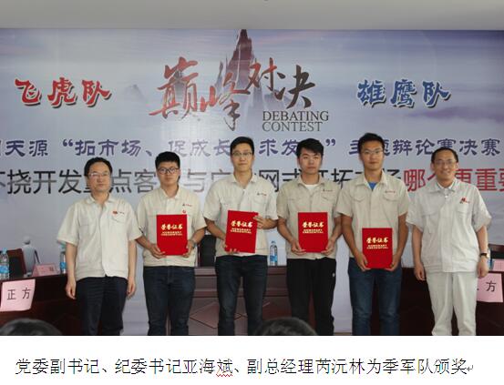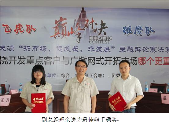 隨后,公(gong)(gong)(gong)司領導(dao)和嘉(jia)賓分(fen)別為(wei)(wei)獲獎隊伍和最佳辯手頒(ban)獎。公(gong)(gong)(gong)司董事長(chang)、黨委(wei)書(shu)記(ji)洪(hong)石笙(sheng)在閉幕講話中指出,本次比賽(sai)形式(shi)新(xin)穎,充分(fen)結合了(le)公(gong)(gong)(gong)司“緊貼市(shi)場求(qiu)(qiu)生存(cun)”的(de)(de)(de)(de)(de)管理(li)理(li)念,為(wei)(wei)公(gong)(gong)(gong)司踐行“致(zhi)力(li)(li)(li)磁業進步、滿(man)足顧(gu)客需求(qiu)(qiu)”的(de)(de)(de)(de)(de)使命進一步統一了(le)思(si)(si)想、提(ti)高了(le)認識。他強(qiang)調,2017年公(gong)(gong)(gong)司明確了(le)“以(yi)市(shi)場為(wei)(wei)導(dao)向,以(yi)創新(xin)促發展(zhan)”的(de)(de)(de)(de)(de)經營(ying)思(si)(si)路,公(gong)(gong)(gong)司也成(cheng)功取得了(le)證(zheng)監會關于(yu)重組(zu)募集配(pei)套資金的(de)(de)(de)(de)(de)批復,公(gong)(gong)(gong)司發展(zhan)即將邁入(ru)新(xin)的(de)(de)(de)(de)(de)階(jie)段,新(xin)形勢(shi)新(xin)任務(wu)要求(qiu)(qiu)我(wo)們要繼續以(yi)百折不撓的(de)(de)(de)(de)(de)精神去(qu)開拓(tuo)市(shi)場,要以(yi)廣撒網式(shi)的(de)(de)(de)(de)(de)精神去(qu)開發客戶(hu),要在新(xin)的(de)(de)(de)(de)(de)行動(dong)上去(qu)實(shi)(shi)現(xian)好(hao)的(de)(de)(de)(de)(de)品(pin)(pin)質,通過這(zhe)種好(hao)品(pin)(pin)質使我(wo)們的(de)(de)(de)(de)(de)核(he)心競爭力(li)(li)(li)得到(dao)強(qiang)化(hua)、鞏(gong)固(gu)和提(ti)高,廣大青年員工(gong)要加(jia)強(qiang)學習,培(pei)養能力(li)(li)(li),把我(wo)們的(de)(de)(de)(de)(de)理(li)念推向客戶(hu),以(yi)實(shi)(shi)際行動(dong)踐行與傳承公(gong)(gong)(gong)司發展(zhan),為(wei)(wei)實(shi)(shi)現(xian)中鋼天源(yuan)早日成(cheng)為(wei)(wei)“國內(nei)一流、國際知名(ming)”的(de)(de)(de)(de)(de)創新(xin)型企業而努力(li)(li)(li)奮斗。