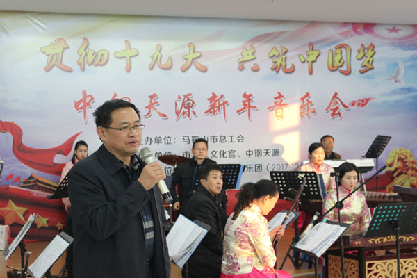 12月21日下午(wu),由(you)馬鞍山市(shi)(shi)總工會(hui)(hui)主(zhu)辦(ban)、中(zhong)鋼天源(yuan)、市(shi)(shi)工人文化(hua)宮承辦(ban)的(de)“貫徹十九大、共筑中(zhong)國夢”新年音樂會(hui)(hui)在(zai)公(gong)司(si)第(di)一培訓教室隆(long)重舉行。市(shi)(shi)總工會(hui)(hui)黨組(zu)書記(ji)、常務(wu)(wu)副(fu)(fu)主(zhu)席(xi)李迅出席(xi)活(huo)動并講話(hua),中(zhong)鋼天源(yuan)常務(wu)(wu)副(fu)(fu)總經理張野、黨委副(fu)(fu)書記(ji)、紀委書記(ji)、工會(hui)(hui)主(zhu)席(xi)亞海斌、副(fu)(fu)總經理吳(wu)剛等出席(xi)活(huo)動,公(gong)司(si)新區100多名員工到場聆(ling)聽了音樂(le)會。