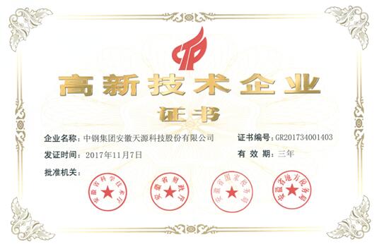 近日,中鋼(gang)天源收到安徽(hui)(hui)省科技廳(ting)(ting)、安徽(hui)(hui)省財政廳(ting)(ting)、安徽(hui)(hui)省國家稅務局、安徽(hui)(hui)省地方(fang)稅務局聯合(he)頒發(fa)的高新(xin)技術企業證書,標(biao)志著中(zhong)鋼天源順(shun)利通(tong)過2017年(nian)第二批“高新技(ji)術企業”重新認定。這(zhe)是對公司多年(nian)來(lai)堅持(chi)自主研發、技(ji)術創新、堅持(chi)走高新技(ji)術發展道(dao)路的(de)有(you)力肯定。