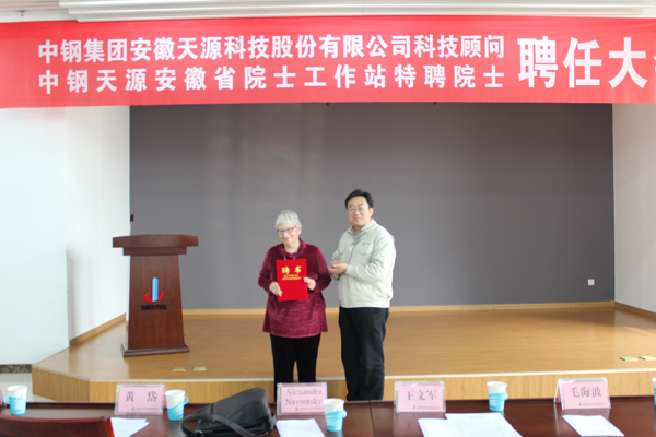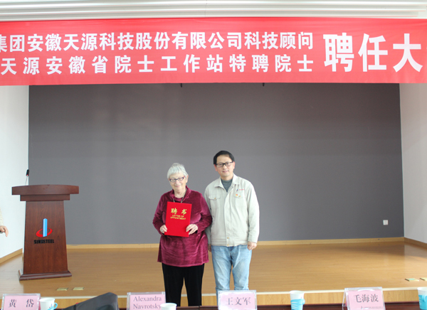 毛(mao)海波總經理(li)在會(hui)上介紹(shao)了Alexandra Navrotsky的(de)簡(jian)況。隨后公司董事長、黨委(wei)書記王文軍與副總工程師裴曉東(dong)分別為Alexandra Navrotsky頒發了中鋼天(tian)源科技(ji)顧問、院(yuan)(yuan)士工作站特聘院(yuan)(yuan)士的聘書。聘任儀式結束后, Alexandra Navrotsky為參會人員作了主(zhu)題為“A Career in Thermodynamics , Geochemitry and materials science”(熱力學、地球(qiu)化學和材(cai)料科學領域的研究概(gai)況)的學術講座。